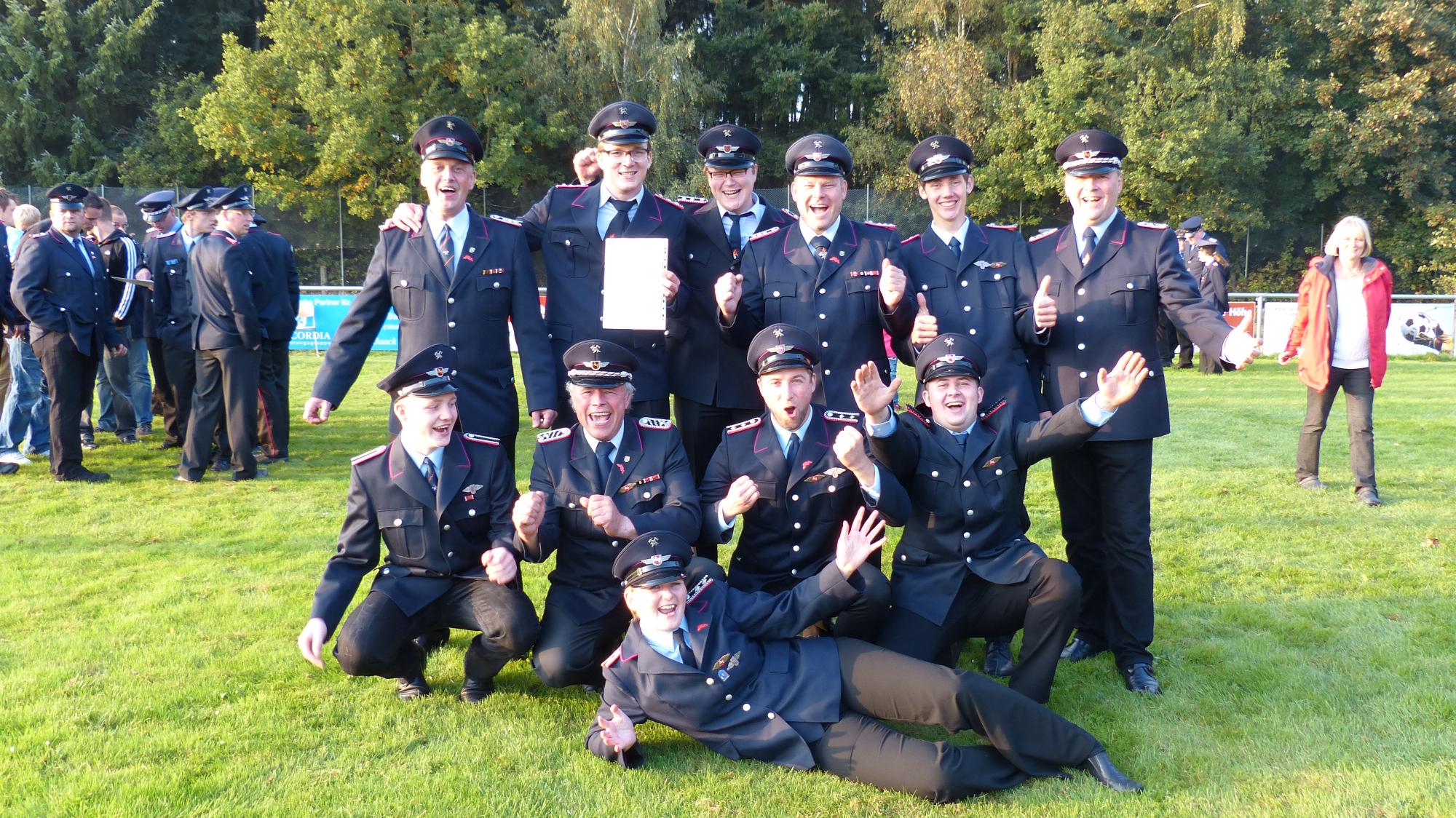 Da die Wettbewerbsgruppe eine der letzten startenden Gruppen war, wurde nach einem kurzem, freudigen Anstoßen wurde dann die Einsatzuniform gegen die Ausgehuniform getauscht und gemeinsam mit allen anderen Gruppen zur Siegerehrung auf den Sportplatz in Lamstedt einmarschiert. In der Wertungsgruppe FPN konnte die Gruppe der Feuerwehr Woltersdorf mit außergewöhnlich guten Zeiten trotz 15 Minuspunkten knapp hinter der Gruppe aus Klein Meckelsen noch den zweiten Platz erreichen. Erfreulich auch der 6. Platz der Feuerwehr Bleckede. Anschließend folgte die Siegerehrung der Wertungsgruppe PFPN, wie immer wurde von hinten angefangen. Als sich die Punktzahlen rund um den 15. Platz erst bei 415 Punkten fanden, kam die silberne Leistungsspange immer näher. Die erste Freude dann beim zehnten Platz, die Teilnahme an der Landesmeisterschaft im kommenden Jahr war sicher! Mit dem neunten Platz, den die Feuerwehr Artlenburg ebenfalls mit einem fehlerfreien Wettbewerb erreichte, war auch die silberne Leistungsspange sicher. Auf dem achten Platz landete die Feuerwehr Garze, genauso fehlerfrei. Erst auf Platz vier fiel dann "Wendhausen", ein Ergebnis, das so keiner wirklich erwartet hatte. So fand die Wettbewerbssaison ihr perfektes Ende!